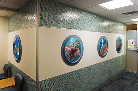 The CHKD hospital incorporated a Luminous SkyCeiling (ellipse) in their oncology care department, along with a series of beautiful porthole windows featuring beautiful sea creatures.
