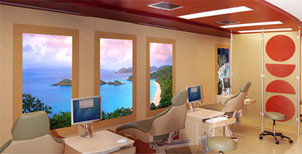 The orthodontic clinic of Dr. Sima Rafati, in the San Francisco Bay Area, features installations of several Sky Factory Luminous SkyCeilings and Luminous Virtual Windows that expand the space and provide engaging and relaxing views to nature. The office was designed by Green Curve Studio, a leading designer of dental and orthodontic offices in the United States.