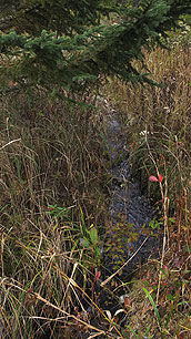 Fresh from recent rain, the rapidly flowing water appears from a hidden source and leaves our view obscured by grasses.