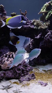 The saltwater reef aquarium is lively with the fluid motion of marine life - tropical fish, coral, and a variety of invertebrates, such as starfish and hermit crabs.